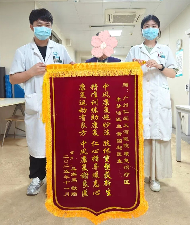 近日,广州仁爱天河医院康复治疗区再次收到一份暖心的认可——一位脑梗康复患者将一面精心准备的锦旗,亲手送到了康复治疗师李梦洁、黄国超手中。