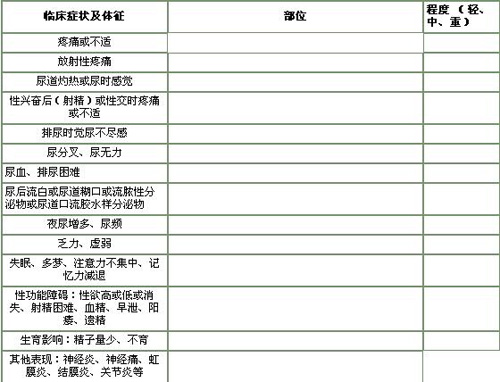 为了早期发现、早期诊断前列腺疾病,特拟定“前列腺疾病症状、体征自查表”如下: